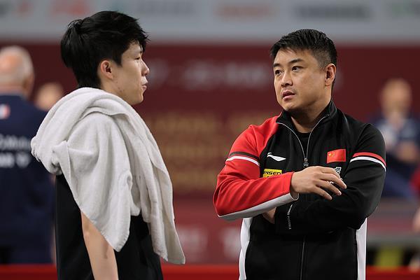 △当地时间5月16日,卡塔尔多哈,王楚钦与王皓赛前训练交流。